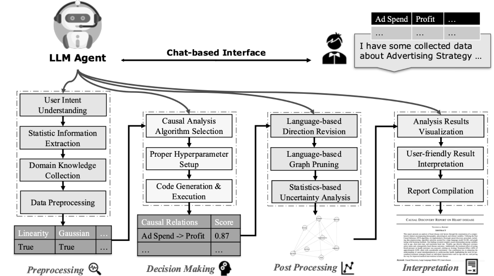 The algorithm selection engine intelligently filters and ranks candidate methods according to data characteristics and task requirements, configures hyperparameters, and executes workflows. Postprocessing incorporates bootstrap-based confidence estimation and LLM-driven conceptual refinement, ensuring both statistical robustness and semantic validity. Finally, the system generates interpretable outputs, including causal graphs, effect estimations, counterfactual simulations, and structured PDF reports.