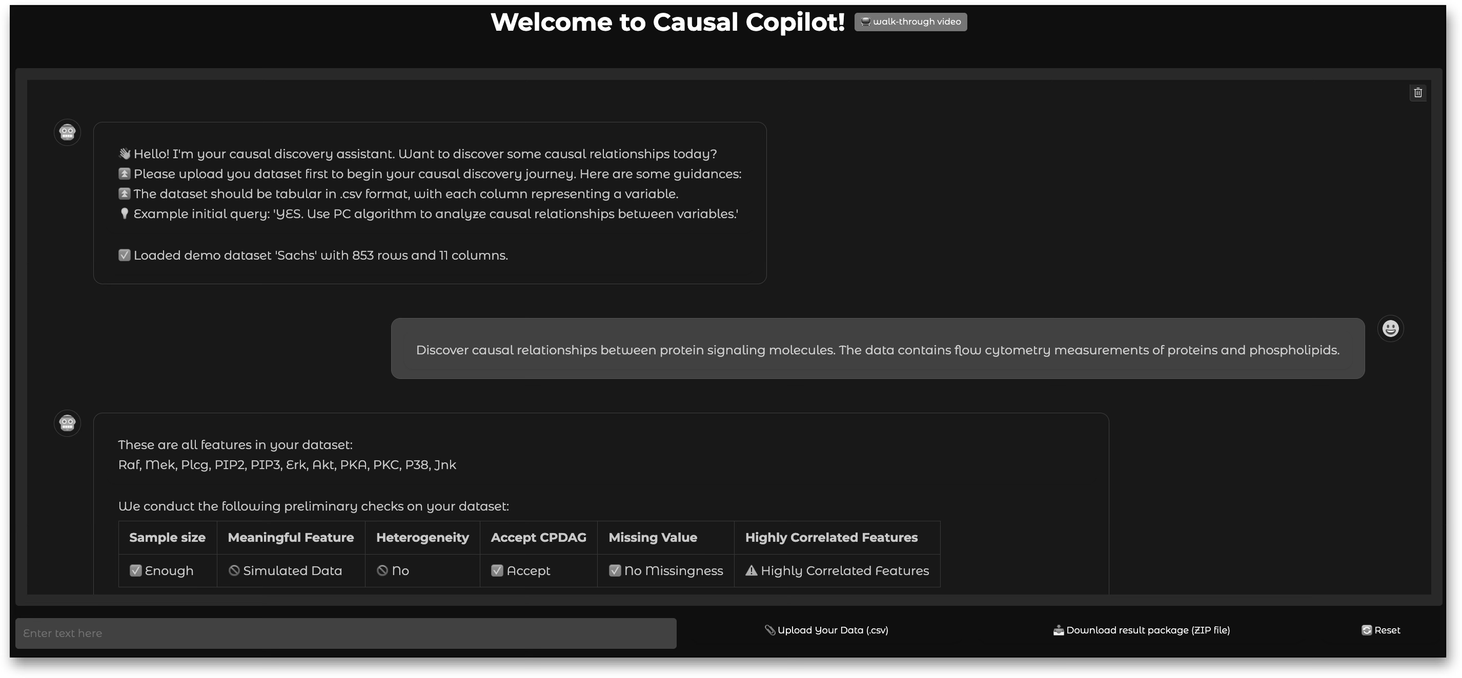 Causal-Copilot addresses these challenges by introducing a large language model (LLM)-driven autonomous agent for end-to-end causal analysis. It integrates natural language reasoning, automated algorithm orchestration, statistical validation, and interpretability into a unified framework. By combining more than twenty state-of-the-art methods, Causal-Copilot democratizes causal reasoning, making it accessible to non-experts while maintaining methodological rigor.